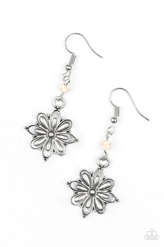 Cactus Blossom Silver White Floral Earrings - Paparazzi Accessories
